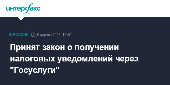 Москва. 6 апреля. INTERFAX.RU - Госдума приняла в третьем чтении закон, который позволяет налогоплательщикам - физическим лицам с 1 июля 2023 г. получать уведомления от налоговых органов через "Единый портал государственных и муниципальных услуг" ("Госуслуги").