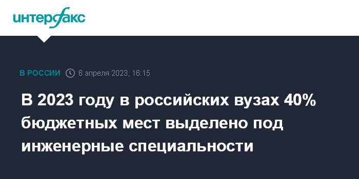 Москва. 6 апреля. INTERFAX.RU - Минобрнауки в 2023 году выделило российским вузам почти 600 тысяч бюджетных мест, из которых 40% отведено инженерным специальностям, сообщил на совещании в Набережных Челнах министр науки и высшего образования Валерий Фальков.
