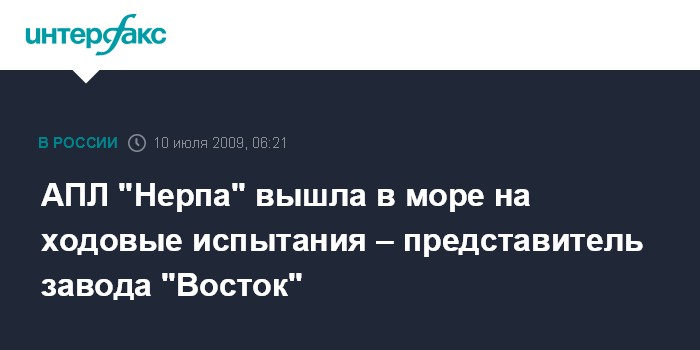 Большой Камень. 10 июля. ИНТЕРФАКС-ДАЛЬНИЙ ВОСТОК - Российская атомная подводная лодка "Нерпа" вышла в море на повторные ходовые испытания, сообщил в пятницу агентству "Интерфакс-Дальний Восток" представитель завода "Восток" (испытательная база Амурского судостроительного завода).
