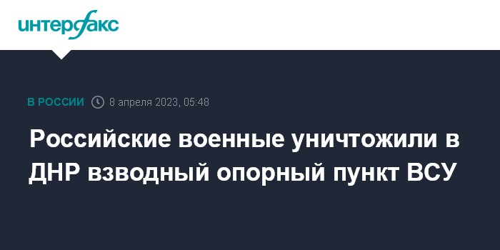 Москва. 8 апреля. INTERFAX.RU - Российские военные уничтожили в Донецкой Народной Республике (ДНР) взводный опорный пункт вооруженных сил Украины (ВСУ), сообщил начальник пресс-центра группировки "Юг" Иван Бигма.