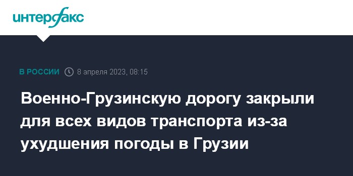 "В связи с ухудшением погодных условий на территории Грузии, невозможностью обеспечения безопасного проезда автотранспортных средств, а также с учетом рекомендаций пограничной полиции Грузии запрещено движение всех видов автотранспортных средств на участке "Владикавказ - н.п. Ларс" - в направлении на выезд из Российской Федерации с 06:00 мск до особого распоряжения", - говорится в сообщении.