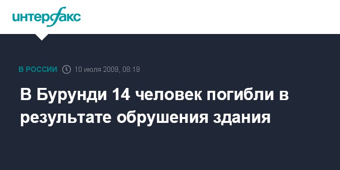 Москва. 9 июля. INTERFAX.RU – По меньшей мере, 14 рабочих погибли и более 40 пострадали в результате обрушения строящегося здания в одном из городов в центральной части Бурунди (Африка), сообщает британская телерадиовещательная корпорация Би-би-си.
