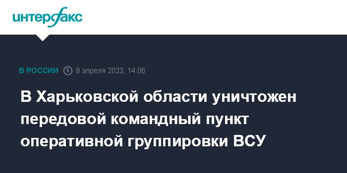 Москва. 9 апреля. INTERFAX.RU - Российские военные заявили, что уничтожили в Харьковской области передовой командный пункт украинских сил.