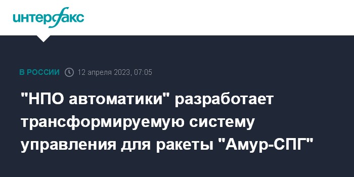 Москва. 12 апреля. INTERFAX.RU - АО "Научно-производственное объединение автоматики им. академика Н.А. Семихатова" ("НПО автоматики", Екатеринбург, входит в состав госкорпорации "Роскосмос") разработает технический проект трансформируемой системы управления для ракеты-носителя "Амур-СПГ", сообщает пресс-служба предприятия.