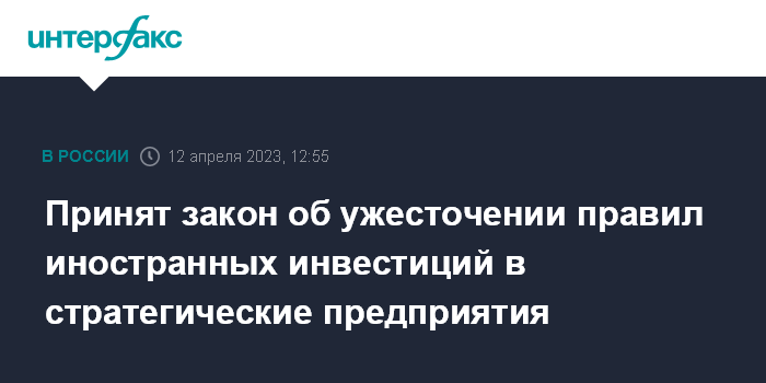 Москва. 12 апреля. INTERFAX.RU - Госдума приняла в третьем чтении закон, который ужесточает правила для иностранного капитала в российских стратегических предприятий и упрощает для государства взыскание имущества у недобросовестных иностранных инвесторов в рамках закона об инвестициях в стратегические хозяйственные общества.