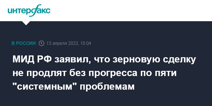 Москва. 13 апреля. INTERFAX.RU - Зерновая сделка не будет продлена после 18 мая без подвижек по пяти "системным" проблемам, заявили в МИД РФ.