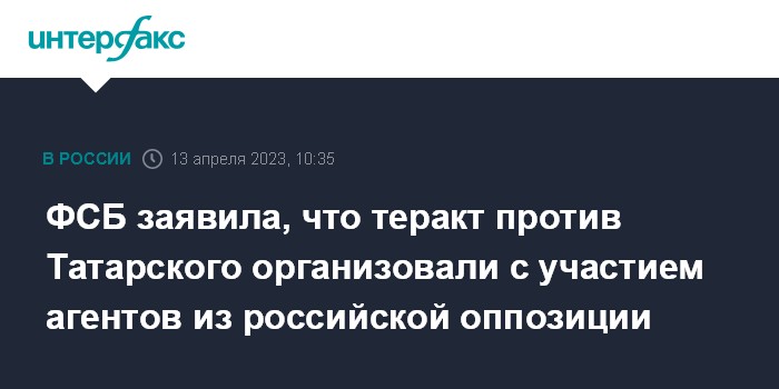 "Федеральной службой безопасности Российской Федерации совместно со Следственным комитетом Российской Федерации и органами полиции установлено, что организаторами теракта 2 апреля 2023 года в г. Санкт- Петербурге, в результате которого погиб военный корреспондент Фомин Максим ("Владлен Татарский") и получили ранения более 50 человек, являлись спецслужбы Украины и их агентура, в том числе из среды скрывающихся за рубежом российских оппозиционеров", - заявили в спецслужбе.