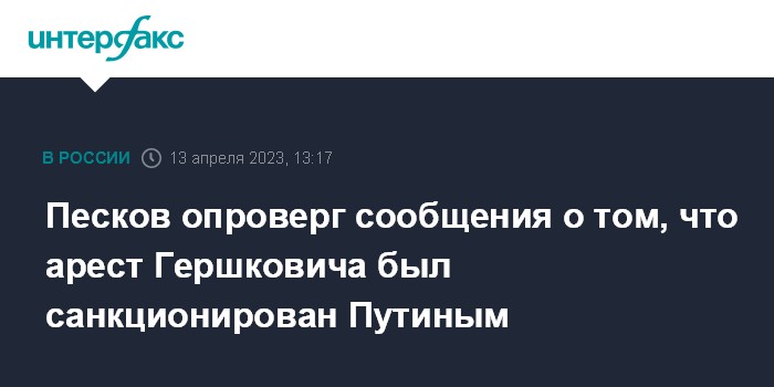 Москва. 13 апреля. INTERFAX.RU - Пресс-секретарь президента Дмитрий Песков опроверг сообщения западных СМИ о том, что Владимир Путин лично предварительно одобрил арест корреспондента The Wall Street Journal Эвана Гершковича, которому ФСБ вменила шпионаж.