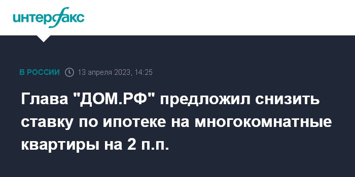 Москва. 13 апреля. INTERFAX.RU - Ставка по ипотеке на многокомнатные квартиры на рынке новостроек может быть ниже базовой на 1-2 п.п., с таким предложением выступил генеральный директор ДОМ.РФ Виталий Мутко на рабочей встрече с президентом РФ Владимиром Путиным.