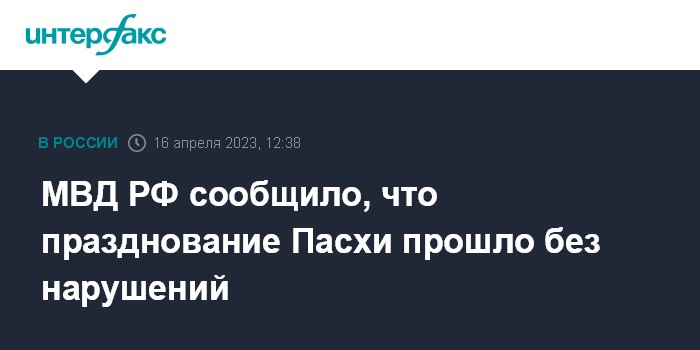 Москва. 16 апреля. INTERFAX.RU - Сотрудники МВД России обеспечили безопасность и порядок во время празднования православного праздника Пасхи, нарушений не допущено, сообщила официальный представитель министерства Ирина Волк.