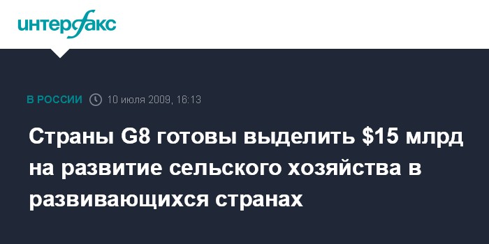 Москва. 10 июля. INTERFAX.RU - Лидеры стран "восьмерки" по итогам саммита в Аквиле заявили о готовности выделить порядка 15 млрд долларов на помощь в развитии сельского хозяйства в развивающихся странах. BBC сообщает, что эти деньги планируется выделить в течение трех лет.