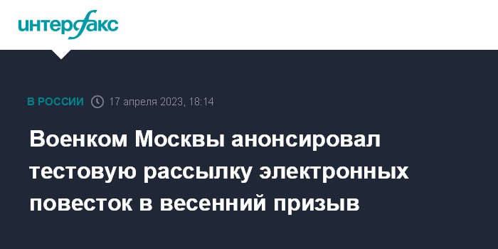 Москва. 17 апреля. INTERFAX.RU - Военный комиссар Москвы Максим Локтев сообщил "Московскому Комсомольцу", что тестовая рассылка повесток через портал "Госуслуги", а также по sms и телефону начнется в весенний призыв.