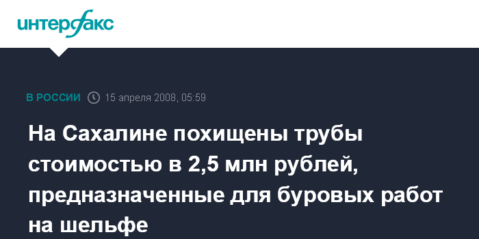Южно-Сахалинск. 15 апреля. ИНТЕРФАКС-ДАЛЬНИЙ ВОСТОК - В Холмске на территории Сахалинского западного морского порта в минувшие выходные дни со склада похищены буровые трубы.