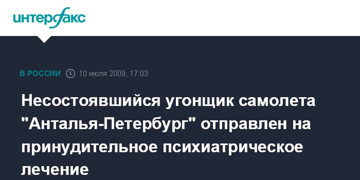 Москва. 10 июля. INTERFAX.RU - Суд Петербурга отправил на принудительное лечение пытавшегося угнать самолет "Анталья-Петербург" в октябре прошлого года Яшу Паша оглы Рашидова. Как сообщили "Интерфаксу" в Северо-Западной транспортной прокуратуре, в пятницу суд постановил применить в отношение подсудимого принудительные меры медицинского характера с помещением его в психиатрический стационар. Собеседник подчеркнул, что на таком выводе суда настаивал гособвинитель.