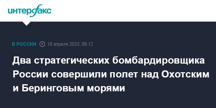 Москва. 18 апреля. INTERFAX.RU - Министерство обороны России сообщило, что два российских стратегических бомбардировщика Ту-95МС выполнили полет в воздушном пространстве над нейтральными водами акваторий Берингова и Охотского морей.