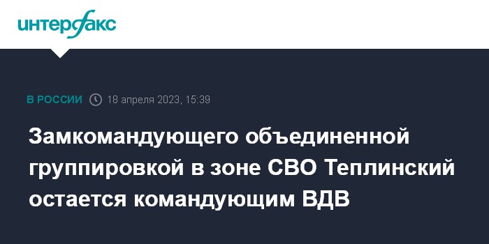 Москва. 18 апреля. INTERFAX.RU - Замкомандующего объединенной группировкой войск генерал-полковник Михаил Теплинский, который докладывал президенту о ситуации на Херсонском и Запорожском направлениях в штабе группировки войск "Днепр", остается командующим ВДВ РФ, сообщил "Интерфаксу" пресс-секретарь президента РФ Дмитрий Песков.
