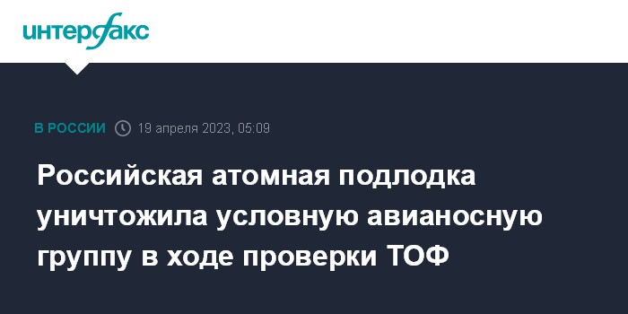 Петропавловск-Камчатский. 19 апреля. INTERFAX.RU - Российские военные сообщили, что в ходе внезапной проверки Тихоокеанского флота (ТОФ) атомная подлодка "Томск" отработала уничтожение авианосной ударной группы условного противника.