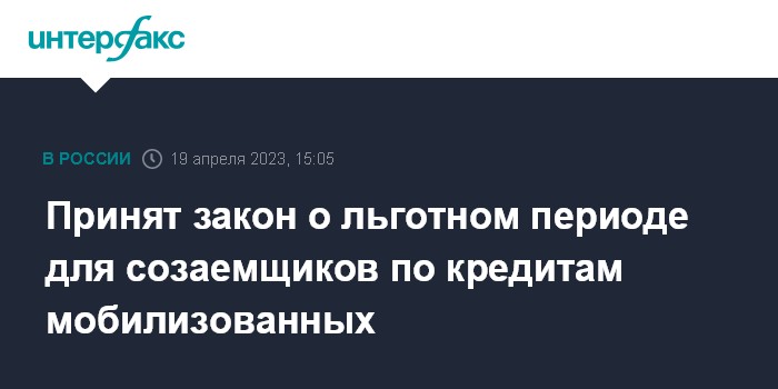 Москва. 19 апреля. INTERFAX.RU - Госдума приняла в третьем чтении закон, который позволяет созаемщикам по кредитам мобилизованных граждан претендовать на предоставление льготного периода, даже если они не являются членом семьи мобилизованного.