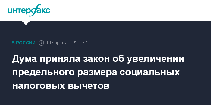 Москва. 19 апреля. INTERFAX.RU - Госдума приняла в третьем чтении закон, который увеличивает предельный размер социального налогового вычета по НДФЛ при расходах на обучение детей до 110 тыс. руб., по иным расходам до 150 тыс. руб.