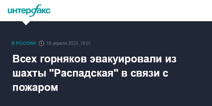 Москва. 19 апреля. INTERFAX.RU - Все горняки, которые находились в кузбасской шахте "Распадская", были выведены на поверхность после пожара, сообщили "Интерфаксу" в экстренных службах.