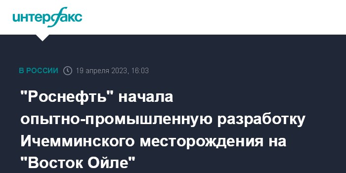 Москва. 19 апреля. INTERFAX.RU - "РН-Ванкор" (входит в нефтегазодобывающий комплекс НК "Роснефть") приступает к опытно-промышленной разработке Ичемминского месторождения проекта "Восток Ойл", говорится в сообщении "Роснефти.