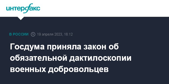 Москва. 19 апреля. INTERFAX.RU - Депутаты Госдумы приняли в третьем чтении закон о дактилоскопической регистрации граждан, пребывающих в добровольческих формированиях.