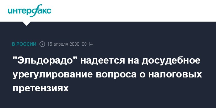 "Рады вам сообщить, что в ближайшее время в деле о налоговых претензиях к нашей компании будет поставлена точка. На данный момент идут переговоры о досудебном урегулировании спорных вопросов относительно налоговых претензий к "Эльдорадо". Финальная сумма претензий уточняется", - говорится в имеющемся в распоряжении "Интерфакса" тексте заявления.