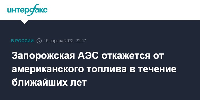 Москва. 19 апреля. INTERFAX.RU - Запасов ядерного топлива производства Westinghouse на Запорожской АЭС (ЗАЭС) хватит на четыре года, планируется полное его замещение на российское, сообщил "Интерфаксу" советник главы концерна "Росэнергоатом" Ренат Карчаа.