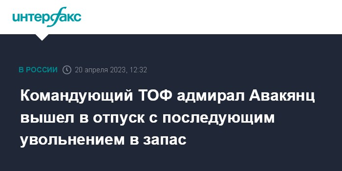 Москва. 20 апреля. INTERFAX.RU - Командующий Тихоокеанским флотом адмирал Сергей Авакянц в настоящее время находится в отпуске с последующим увольнением в запас по достижении предельного возраста службы в Вооруженных силах, сообщила пресс-служба вице-премьера Юрия Трутнева.