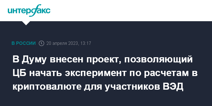 Москва. 20 апреля. INTERFAX.RU - Группа депутатов внесла в парламент поправки в закон об экспериментальных правовых режимах (ЭПР) в сфере цифровых инноваций, которые позволяют ЦБ создать экспериментальную площадку для использования криптовалют и цифровых финансовых активов (ЦФА) в международных расчетах.