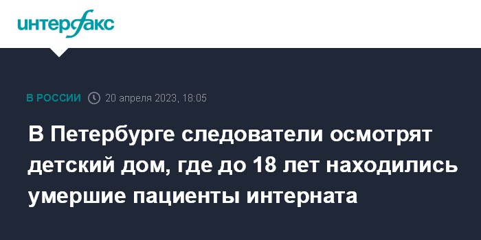 Москва. 20 апреля. INTERFAX.RU - Следственные действия проходят в петербургском детском доме-интернате, где до совершеннолетия содержались умершие постояльцы психоневрологического интерната (ПНИ). Об этом сообщает в четверг пресс-служба Главного следственного управления СКР по городу.