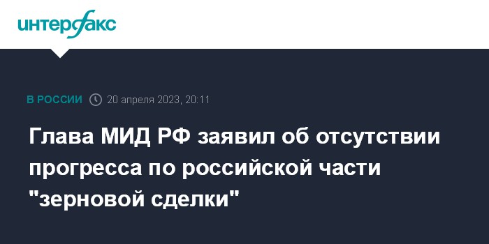 Москва. 20 апреля. INTERFAX.RU - В плане выполнения российской части "зерновой сделки" практически ничего не сделано, заявил в четверг глава МИД РФ Сергей Лавров.