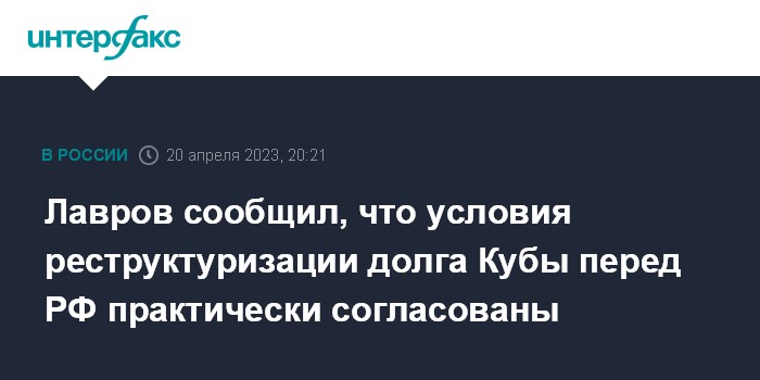 Москва. 20 апреля. INTERFAX.RU - Работа по реструктуризации долга Кубы перед Российской Федерацией практически завершена, заявил глава МИД РФ Сергей Лавров.