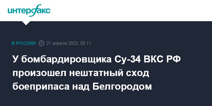 "20 апреля 2023 г. около 22:15 по Москве при выполнении полета самолета Су-34 Воздушно-космических сил над городом Белгород произошел нештатный сход авиационного боеприпаса", - говорится в сообщении.