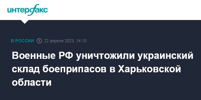 Москва. 22 апреля. INTERFAX.RU - Склад боеприпасов украинской армии уничтожен в Харьковской области, сообщил официальный представитель министерства обороны РФ Игорь Конашенков.