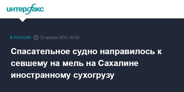 Москва. 23 апреля. INTERFAX.RU - Аварийно-спасательное судно "Берингов пролив" следует к севшему на мель в районе сахалинского порта Шахтерск иностранному судну, сообщила пресс-служба областного управления МЧС РФ.