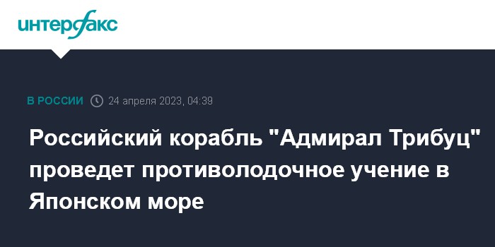 Москва. 24 апреля. INTERFAX.RU - Большой противолодочный корабль "Адмирал Трибуц" Тихоокеанского флота (ТОФ) проведет противолодочное учение в Японском море, сообщила в понедельник пресс-служба флота.