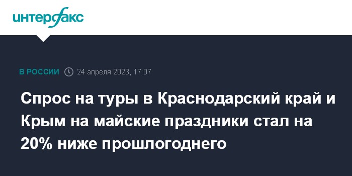 Москва. 24 апреля. INTERFAX.RU - Краснодарский край стал лидером спроса на майские праздники, однако продажи туров и на кубанские курорты, и в Крым снизились на 15-20% по сравнению с аналогичным периодом прошлого года, сообщил вице-президент Ассоциации туроператоров России (АТОР), гендиректор туроператора "Дельфин" Сергей Ромашкин.