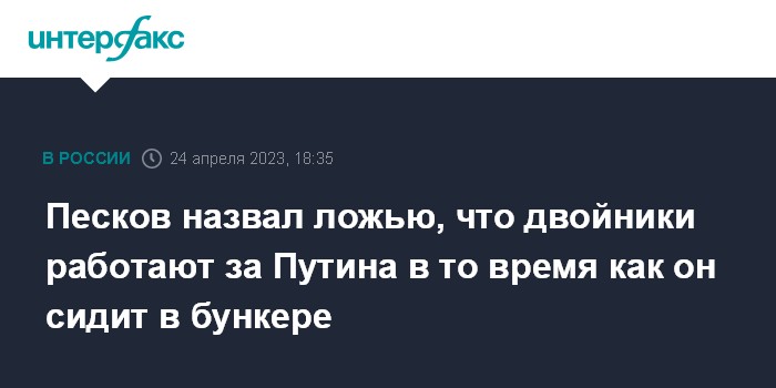 Москва. 24 апреля. INTERFAX.RU - Предположения о том, что у президента РФ Владимира Путина много двойников, которые вместо него участвуют в мероприятиях в то время как он находится в бункере, являются ложью, заявил его пресс-секретарь Дмитрий Песков.