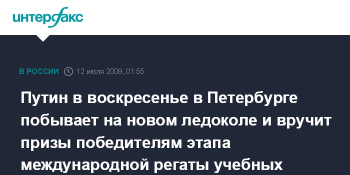 Следующим пунктом программы В.Путина в Санкт-Петербурге станет участие в церемонии завершения очередного этапа международной регаты учебных парусных судов "The Tall Ships‘ Races Baltic - 2009". Предполагается, что глава правительства, под патронатом которого проходит петербургский этап регаты, примет участие в награждении первых победителей парусной гонки и посетит российский парусник "Мир", лидировавший с первого дня соревнований.