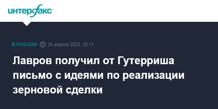 Москва. 24 апреля. INTERFAX.RU - Глава МИД РФ Сергей Лавров после встречи с генеральным секретарем ООН Антониу Гутерришем сообщил, что получил от главы всемирной организации письмо с идеями по полной реализации зерновой сделки.