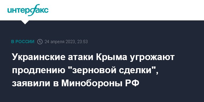 Москва. 24 апреля. INTERFAX.RU - В министерстве обороны России заявили, что попытки Киева атаковать базу Черноморского флота и другие объекты в Крыму морскими беспилотниками ставят под угрозу очередное продление "зерновой сделки" после 18 мая.