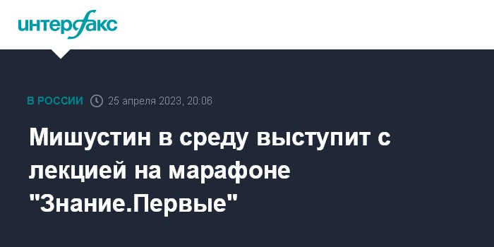 Москва. 25 апреля. INTERFAX.RU - Премьер-министр Михаил Мишустин 26 апреля прочитает лекцию на просветительском марафоне "Знание.Первые" и ответит на вопросы участников мероприятия, сообщает пресс-служба правительства.