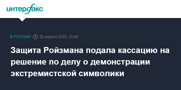 Москва. 26 апреля. INTERFAX.RU - Защита бывшего мэра Екатеринбурга Евгения Ройзмана (признан в России иноагентом) подала кассационную жалобу на решение суда, который назначил ему 14 суток ареста по делу о демонстрации символики экстремистской организации, сообщил "Интерфаксу" его адвокат Владислав Идамжапов.
