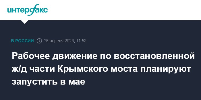 Москва. 26 апреля. INTERFAX.RU - Восстановление железнодорожной части Крымского моста идет с опережением графика, рабочее движение здесь будет запущено уже в мае, сообщил начальник ФКУ "Упрдор "Тамань" Никита Храпов.