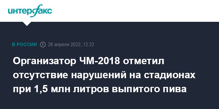 Москва. 26 апреля. INTERFAX.RU - На стадионах, где в 2018 году проводились матчи Чемпионата мира по футболу, не было зафиксировано ни одного нарушения, при том, что на трибунах было выпито около 1,5 млн литров пива, заявил в Госдуме бывший гендиректор оргкомитета "Россия 2018" Алексей Сорокин.