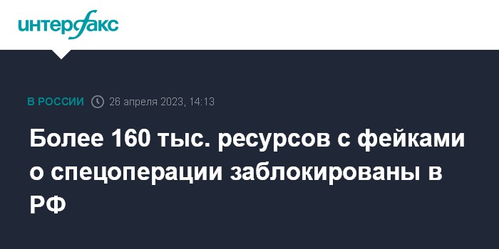 Москва. 26 апреля. INTERFAX.RU - Роскомнадзор (РКН) заблокировал на территории РФ с 24 февраля прошлого года более 160 тыс. ресурсов с заведомо недостоверной информацией о ходе военной операции на территории Украины, сообщает служба в среду.