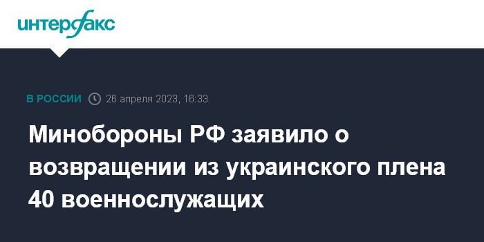Москва. 26 апреля. INTERFAX.RU - Сорок российских военных возвращены из украинского плена в результате переговоров, сообщило Минобороны РФ в среду.