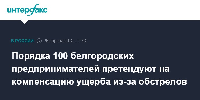 Москва. 26 апреля. INTERFAX.RU - Предприниматели Белгородской области, бизнес которых пострадал в результате обстрелов с украинской стороны, начали подавать документы на получение компенсации ущерба, сообщила пресс-служба областного правительства в среду.