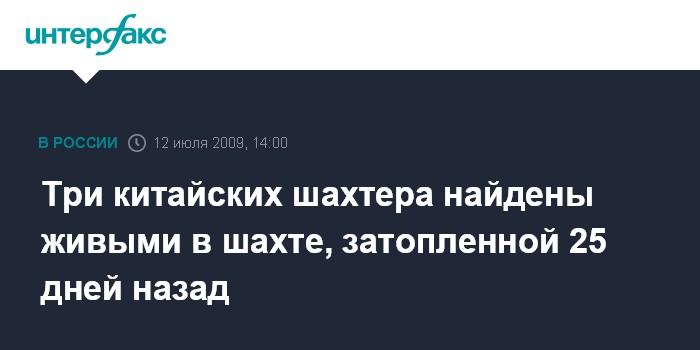 Лондон. 12 июля. INTERFAX.RU - Китайские спасатели обнаружили троих живых шахтеров, пропавших 25 дней назад, когда их шахту затопило, сообщает в воскресенье Би-би-си.